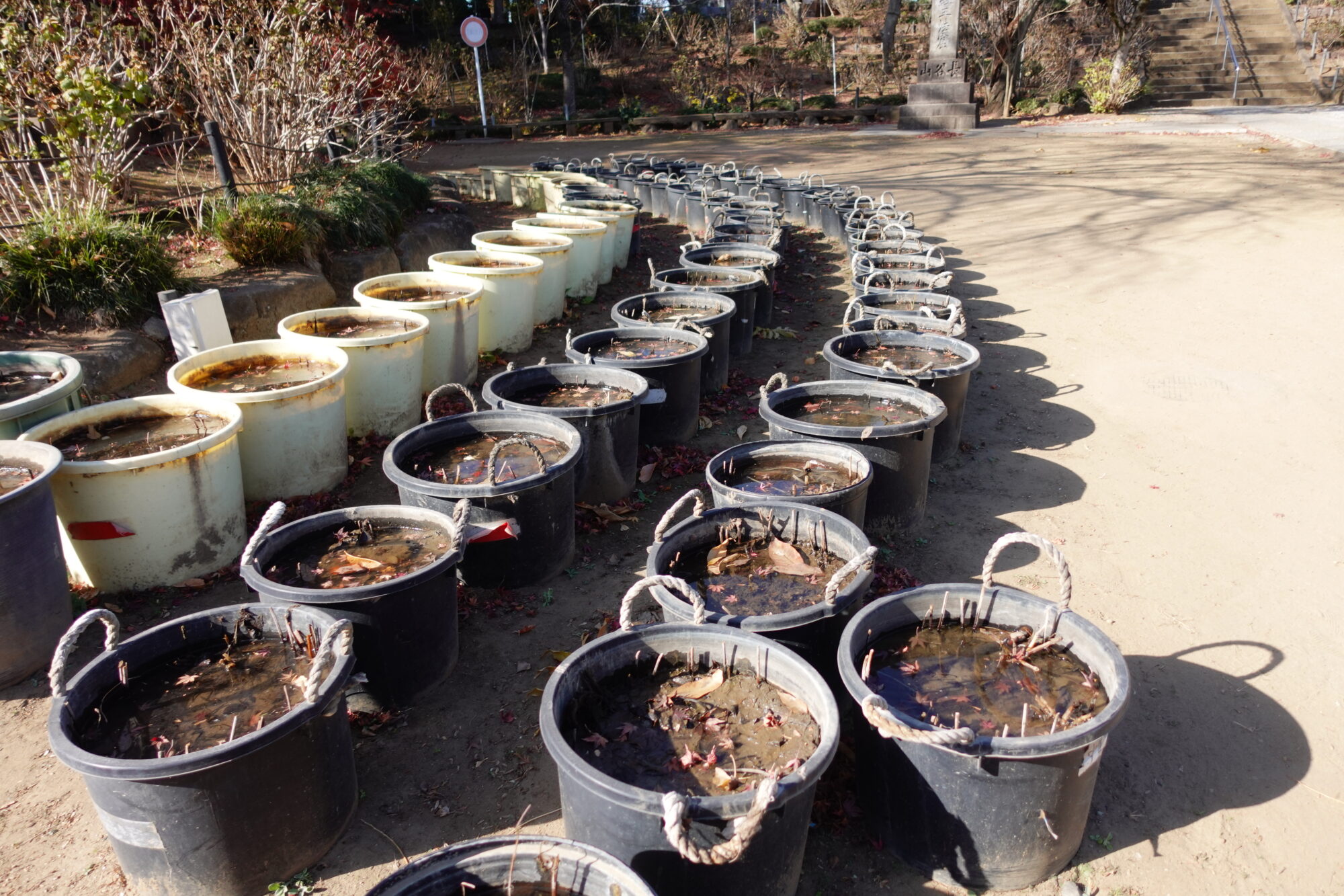 並べられたバケツに惹かれる次女